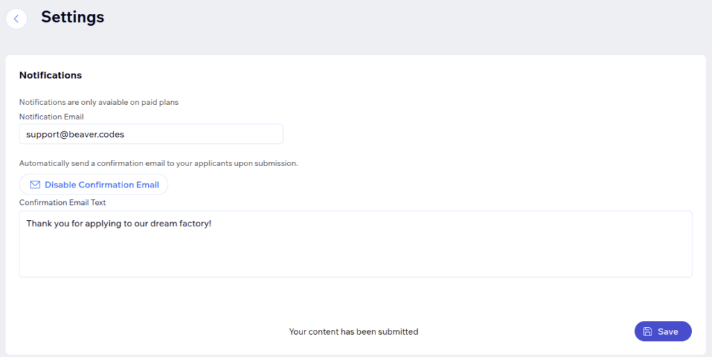 Navigate to the app settings to configure notification emails that you’ll receive when new applications are submitted: